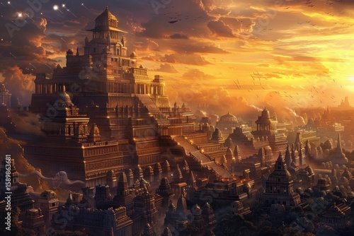 sky, light, fantasy, city, ancient, city landscape, architecture, art, digital, wallpaper, gold, sunset, metropolis, urban, intricate, cloud, vibrant, background, kingdom, building, empire, history, earth, hours, exotic, culture, lost, dramatic, imagination, detail, majestic, civilisation, three-dimensional, illustration, historic, epic, atmospheric, mythical, temple, concept, palace, artistry, tower, historical building, rendering, game, grandeur, prosperity, legendary