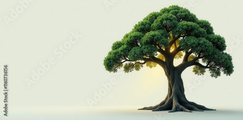 Majestic ancient tree with vibrant foliage illuminated by soft sunlight, standing majestically on a tranquil, light-grey background