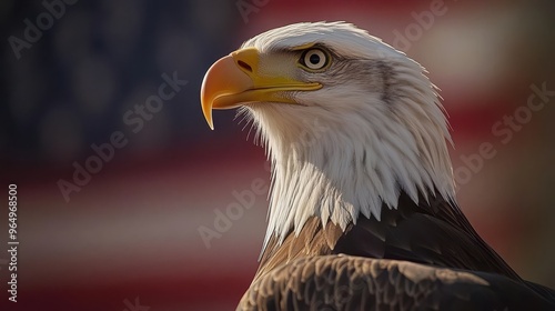 Majestic Bald Eagle Close-Up with American Flag Background Symbolizing Freedom and Patriotism