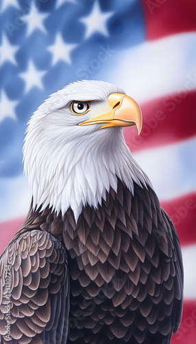 Majestic bald eagle portrait against a US flag backdrop