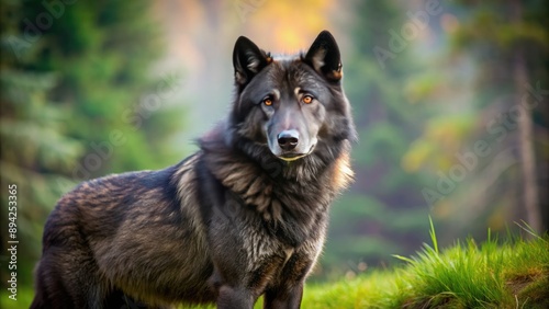 Majestic black wolf stands calmly, surrounded by serene wilderness, as a loving arm wraps around its neck, conveying a deep emotional connection with nature.
