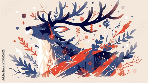 cervid, reindeer, antler, winter, snow, christmas, holiday, festive, ornament, floral, plant, branch, leaf, foliage, design, art, illustration, graphic, style, season, celebration, nature, wildlife, animal, majestic, elegant, cosy, warm, peaceful, serene, beautiful, artwork, image, picture, drawing, painting, pattern, background, card, poster, print, decoration, vector, abstract, modern, contemporary, stylish, trendy, vintage