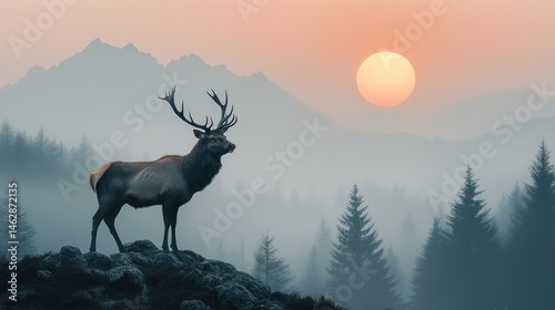 cervid, elk, stag, wildlife, nature, mountain, sunrise, sunset, morning, mist, fog, rocky, peak, summit, timberland, forest, tree, pine, silhouette, landscape, animal, horned, antler, brown, grey, calm, peaceful, serene, beauty, spectacular, photo, digital, art, scenic, view, horizon, gold, light, colours, dramatic, atmosphere, texture, detail, grandeur, wild, solitude, elevation, conservation