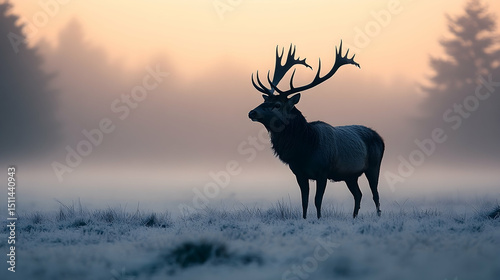 morning, silhouette, quiet, cervid, antler, timberland, foggy, winter, light, outdoors, nature, cold, wildlife, serene, majestic, grass, field, glacé, sunrise, dawn, landscape, scenic, animal, calm, beauty, large, soft, tranquil, pastel, frost, elegant, mist