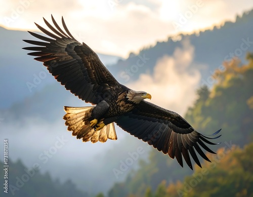 eagle, soaring, flight, misty, mountain, forest, sunrise, wing, nature, wildlife, bird, powerful, majestic, freedom, sky, horizon, landscape, photo, beauty, wild, feather, flying, bird of prey, autumn, aerial, fly up, power, strength