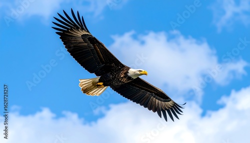 eagle, soaring, sky, flight, bird, wing, powerful, majestic, freedom, nature, wildlife, birding, cloud, beautiful, blue, animal, outdoors, photo, sharp, detail, aerial