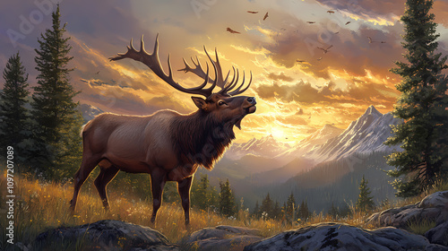 Majestic elk bugling at sunrise. Majestic Elk Forest. Illustration