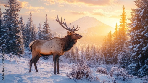 Majestic Elk Standing in Snowy Forest at Sunrise in Winter Landscape