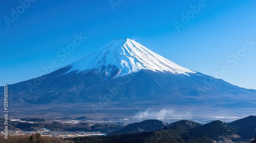 Majestic frontal view of Mt. Fuji during winter, with a clear blue sky and pristine snow covering the mountain's peak and surrounding slopes.