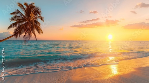 Majestic golden sunrise over tranquil sea waves with a single palm tree standing on the beach