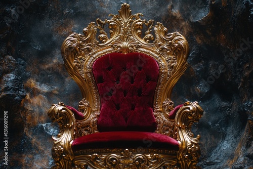 Majestic Golden Throne with Crimson Velvet Seat Against a Dark Textured Backdrop Royalty and Power Symbolism Rich and Elegant Design
