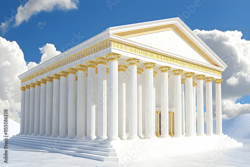 Majestic Greek temple, white marble columns, gold accents, under a bright blue sky with fluffy clouds. Ideal for concepts of history, architecture, and mythology.