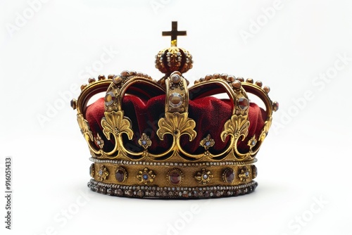 Majestic headpiece, crown isolated against a white background, emphasizing its detailed craftsmanship and noble significance, ideal for focusing on the grandeur and tradition of royalty.