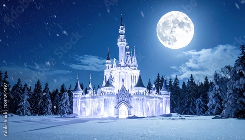 Majestic, illuminated castle in winter wonderland, under a bright full moon