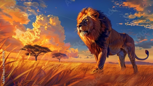 majestic lion resting in the golden grass of the savanna at sunset, capturing the beauty of wildlife in its natural habitat