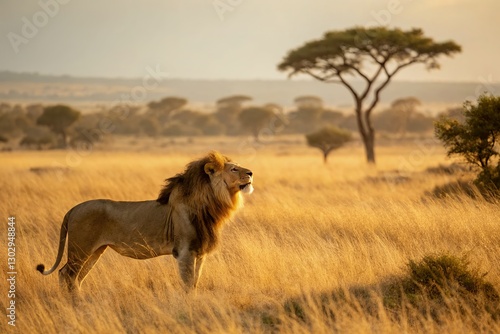 Majestic Lion Standing Proudly in a Golden Sunset Savannah Landscape