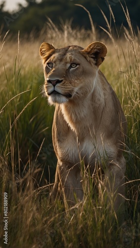 majestic lioness on the hunt for some prey in high grass, stock photo, background