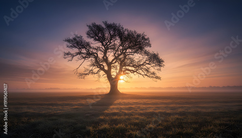 tree, sunrise, mist, field, landscape, silhouette, sunburst, lone tree, morning, dawn, fog, golden hour, tranquil, peaceful, serene, nature, beauty, rural, countryside, outdoors, branch, environment, backlight, glowing, warm light, colorful sky, hopeful, aethereal, mystical, spiritual, calm, quiet, serenity, vibrant, plain, meadow, horizon, huge, open space, orange, gold, yellow, purple, blue, copy space, inspiration