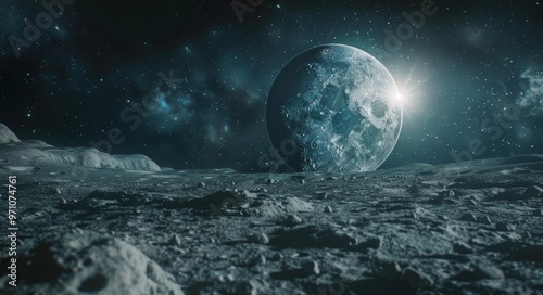 moon, lunar, space, astronomy, galaxy, universe, celestial, crater, landscape, rock, ice, frost, glacé, starry, sky, night, science fiction, fantasy, mystery, adventure, discovery, wonder, tranquil, serene, sublime, immensity, solitude, isolation, loneliness, aethereal, surreal, dramatic, atmospheric, moody, majestic, epic, panoramic, cinematic, mysterious, captivating, breathtaking, outer space, celestial bodies, cosmic, galactic, interstellar, extraterrestrial