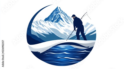 fishing, mountain, lake, man, angler, nature, water, scene, snowy, peak, landscape, serenity, calm, peace, activity, sport, adventure, wildlife, rod, line, reel, catch, blue, white, cold, winter, illustration, graphic, design, vector, art, image, style, silhouette, minimalist, abstract, creative, visual