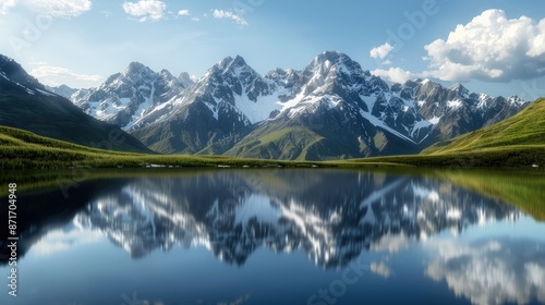 Majestic mountain landscape with dramatic peaks, alpine meadows, and a tranquil lake reflecting the scenery