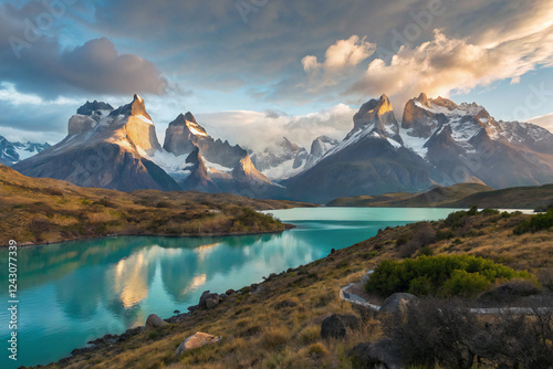 mountain landscape, scenic view, dramatic sky, natural beauty, golden light, national park, patagonia, chile, mountain chain, travel destination, south america, cloudy sky