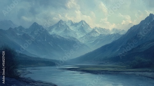 mountain, river, landscape, nature, serene, vale, peak, cloud, water, vista, sky, blue, tranquil, wilderness, scenic, horizon, forest, mountainous, calm, alpine, distant, pristine, aethereal, atmosphere, panoramic, majestic, wild, untouched, ridge, glacial, highland, summit, immensity, grandeur, depth, remote, solitude, stillness, dreamlike, contemplative, open, expanse, peaceful, height, perspective