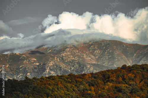 mountain, cloud, forest, autumn, nature, landscape, scenic, peak, autumn color, natural beauty, mountain chain, dramatic sky, outdoors, wilderness, majestic, hillside, atmospheric, cloudy sky, mountain scenery, travel, picturesque, autumn landscape, nature scene, scenic view, highland, autumn forest