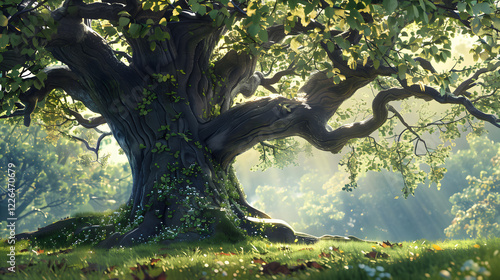 Majestic Oak Tree Illustration Captured at the Peak of Grandeur Encompassing Strength and Resilience Amidst a Serene Environment.