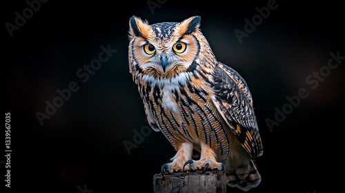 owl, bird, wildlife, animal, nature, feather, eye, yellow, brown, tan, dark, black, background, photo, majestic, wise, wisdom, nocturnal, perched, wood, post, texture, detailed, sharp, sharpened, image, stock, photo, picture, design, decor, branding, marketing, advertising, education, documentary, symbol, beauty, nature conservation, artistic, visual