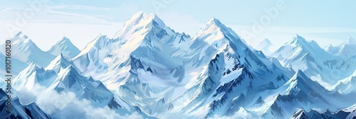 Majestic peaks rise dramatically against the blue sky, dusted with snow and surrounded by wispy clouds in the morning hours. Generative AI