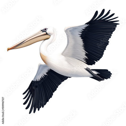 Majestic pelican soaring over tranquil waters clipart, isolated on transparent background.