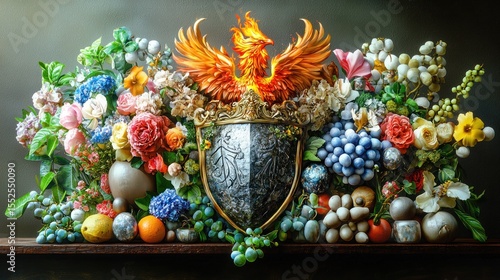 flower, phoenix, shield, fruit, still, life, painting, artistic, artwork, bouquet, rose, grape, ornate, colourful, vibrant, fantasy, mythical, regal, rich, elegant, masterpiece, detail, texture, composition, symbolism, heritage, vintage, gold, silver, dark, background, decorative, design, flora, nature, object, photo, image, illustration