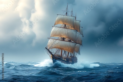 sailboat, ship, sailing, sea, ocean, storm, wave, wind, cloud, sky, historical, maritime, adventure, travel, voyage, powerful, dramatic, moody, nautical, vintage, sailing vessel, weather, nature, artistic, photo, closeup, landscape, blue, white, beige, art, illustration, artwork, digital artwork, hi-res, detail, texture, exploration, heritage