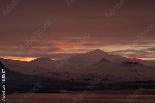 horizontal, awe, cold, color image, dramatic sky, environment, iceland, landscape, majestic, mountain, mountain chain, nature, no people, outdoors, photo, remote, snow, snow-covered, sunrise, sunset, tranquil scene, calmness, travel, travel destination, view, winter