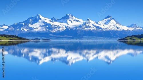 Majestic snow capped mountains reflected in a calm lake