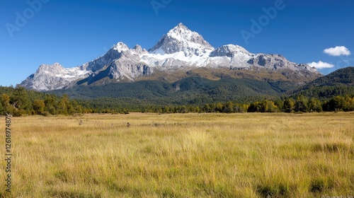 Majestic snow-capped mountain, autumn meadow, clear sky, scenic landscape, travel poster