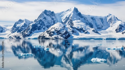 Majestic snow-capped mountains rise above calm ocean waters reflecting icebergs under a clear blue sky, polar landscape.