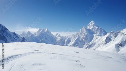 Majestic snow-capped mountains under a clear blue sky, showcasing a vast snowy landscape; ideal for travel brochures