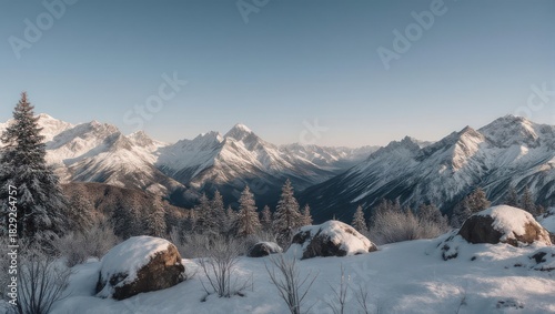 Majestic Snow-Covered Mountain Range with Pine Trees and Clear Sky.