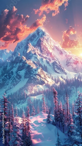 Majestic Snowy Mountain Landscape at Breathtaking Sunrise or Sunset in Serene Wilderness Rugged Untouched Nature with Awe Inspiring Ethereal Sky and Dramatic Lighting Creating a Peaceful