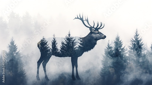 stag, silhouette, side, view, double, exposure, foggy, forest, cinematic, lighting, aethereal, atmosphere, majestic, wildlife, nature, mystical, enchanting, surreal, dreamy, fantasy, magical, timberland, wilderness, cervid, beautiful, creature, wild, animal, misty, wood, mystic, ghostly, atmospheric