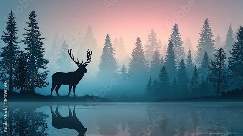 lake, fog, wildlife, atmosphere, horizon, stylised, pink, quiet, water, natural, habitat, monochrome, forest, tranquil, dawn, stillness, bright, blue, wilderness, tree, nature, landscape, silhouette, animal, deep, calm, beautiful, scenery, evening, gradient, border, graphic, cervid, dusk, peaceful, colourful, stag, morning, outdoors, wood, majestic, mist, serene, twilight, antler, pine