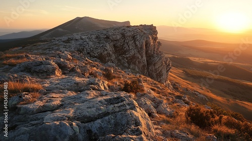 sunset, mountain, ridge, rock, landscape, vista, gold, hours, scenic, view, nature, outdoors, travel, adventure, panorama, scenery, hill, cliff, peak, wilderness, exploration, horizon, sky, sunlight, beauty, majestic, dramatic