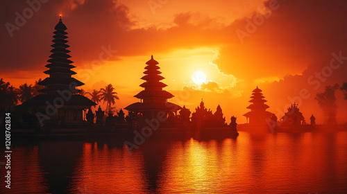Majestic sunset over silhouetted temples and palm trees in Bali