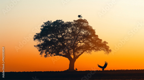 sunset, silhouette, tree, nature, dramatic sky, bird, calmness, natural beauty, warm tones, minimalist, landscape, twilight, serene, scenic, golden hour, dusk, peaceful, evening, branch, sky, harmony, solitude, photo, countryside, calm, atmospheric, rural, horizon, orange sky, tranquil scene, warm colors, scenic view, artistic, evening light, wild bird