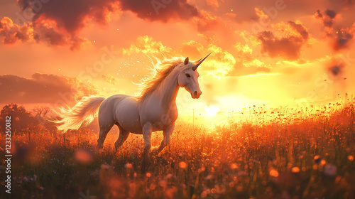 majestic, unicorn, enchanting, sunset, meadow, mystic, illustration