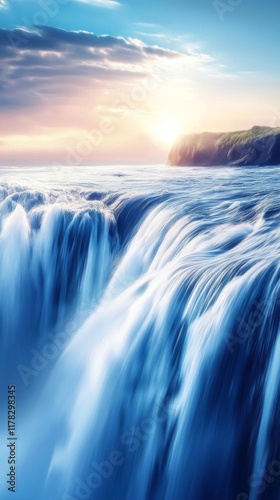 waterfall, sunset, ocean, water, nature, landscape, blue, sky, rock, cliff, serene, tranquil, beautiful, scenic, peaceful, majestic, powerful, flowing, cascading, dreamy, dramatic, light, cloud, horizon, vista, view, photo, image, picture, natural, wonder, scene, panorama, travel, destination, escape, relaxing, refreshing, vibrant, energy, motion, fluid, dynamic