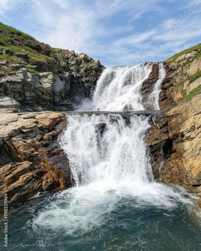 Majestic waterfall cascading over rocky cliffs into clear water pool.