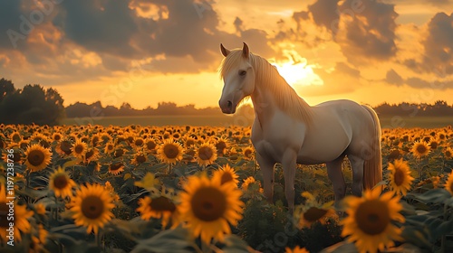 Majestic white horse standing in a vibrant sunflower field at sunset.